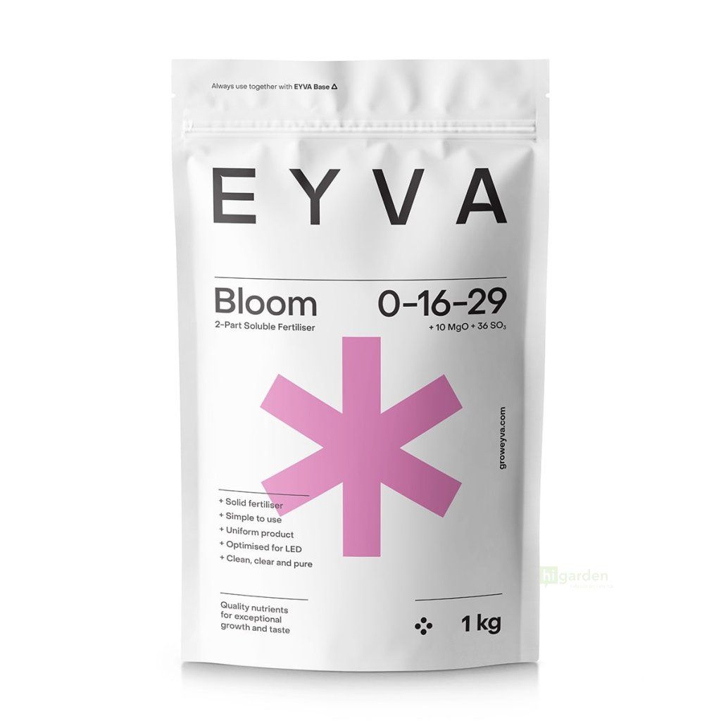EYVA Solid Bloom is a powdered fertilizer that is always used in combination with the base ingredient EYVA Solid Base during the entire flowering phase. Prepare the nutrient solution by mixing the required amount of powder with water according to the growing schedules. Never combine powder and liquid base fertiliser.