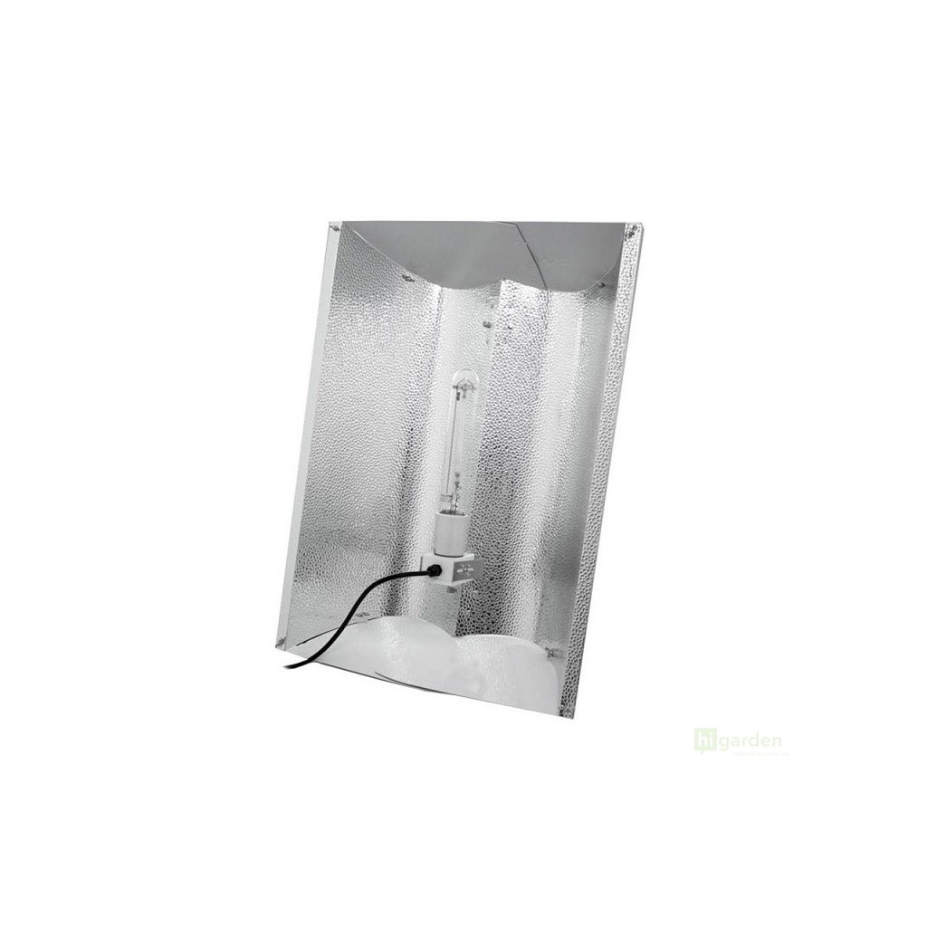 The shade is made of reflective Hammertone Focal 90 aluminium, which has a reflectivity of up to 90% and is designed for HPS and MH lamps from 150W to 1000W. For indoor and tent use.