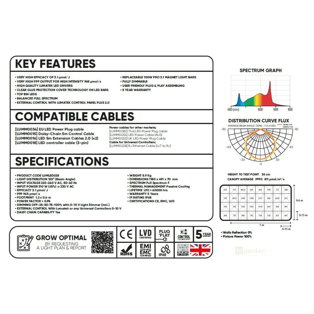 LUMATEK ZEUS 300W PRO 3.1 is a powerful LED grow light with an extraordinary efficiency of 3.1 µmol/J and a luminous flux of 965 µmol/s, designed to cover an area of 1.2 x 0.6 m. Its even light distribution makes it ideal for both hobby growers and professionals who focus on smaller or specific growing zones.