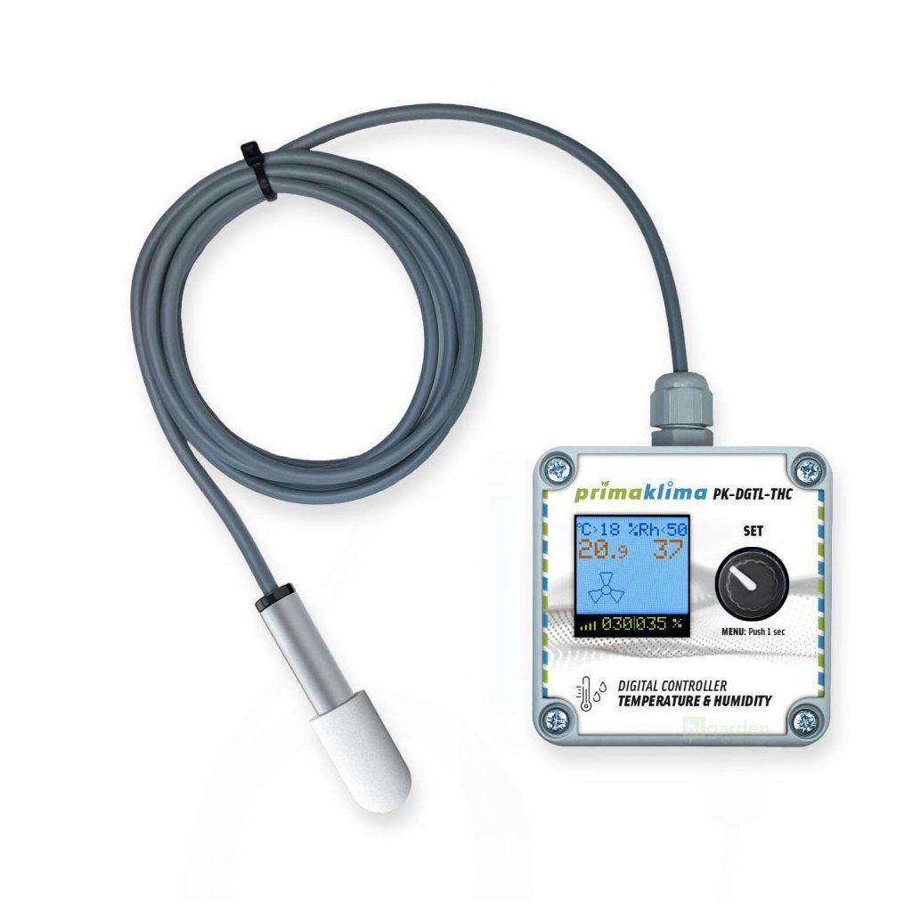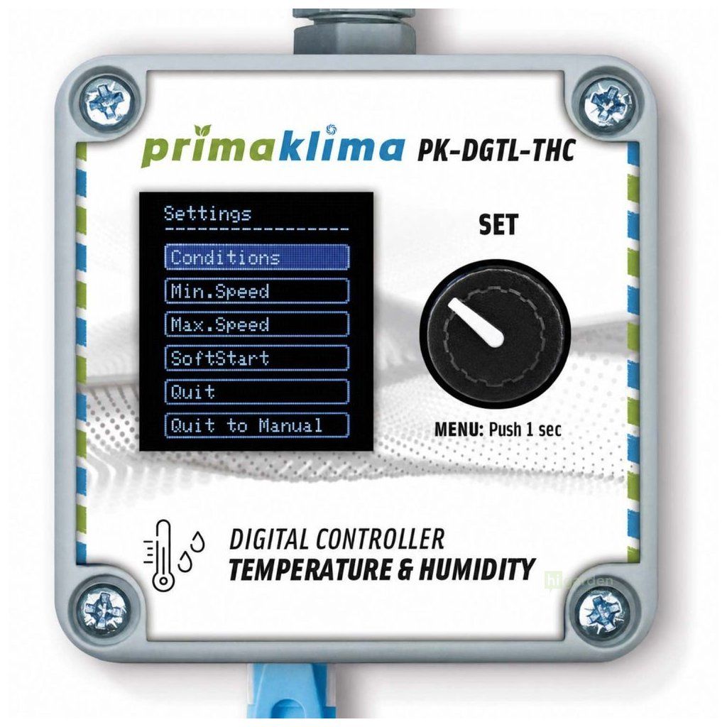The Prima Klima PK-DGTL-THC is a professional two-channel fan controller with integrated RJ45 interface, designed for precise climate control in grow rooms. The clear display allows quick control of all important parameters.