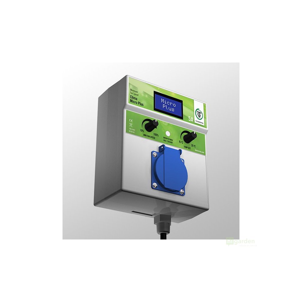 The Clima Micro Plus 5A controls the minimum speed of a ventilator to reach or maintain the optimal temperature in the grow room or tent. It's pretty easy to use - simply turn the two knobs to adjust the minimum ventilator speed (0-100%) and to set the optimal room temperature (15°C-35°C). The regulator has adjustable hysteresis in a range from 1°C to 5°C.