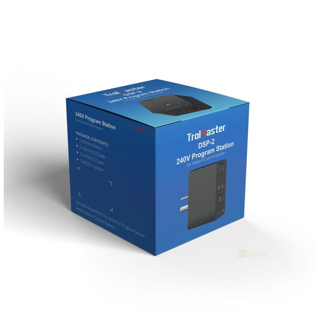 The TrolMaster DSP-2 programming device module (timer module) functions as a multifunction timer. The DSP-1 module allows the user to easily connect any device to the Hydro-x system that needs to be controlled by the TIME function. The DSP-2 module allows any device to be controlled according to world standard voltage (100-240 VAC, 50/60 Hz), up to 10 amps.
