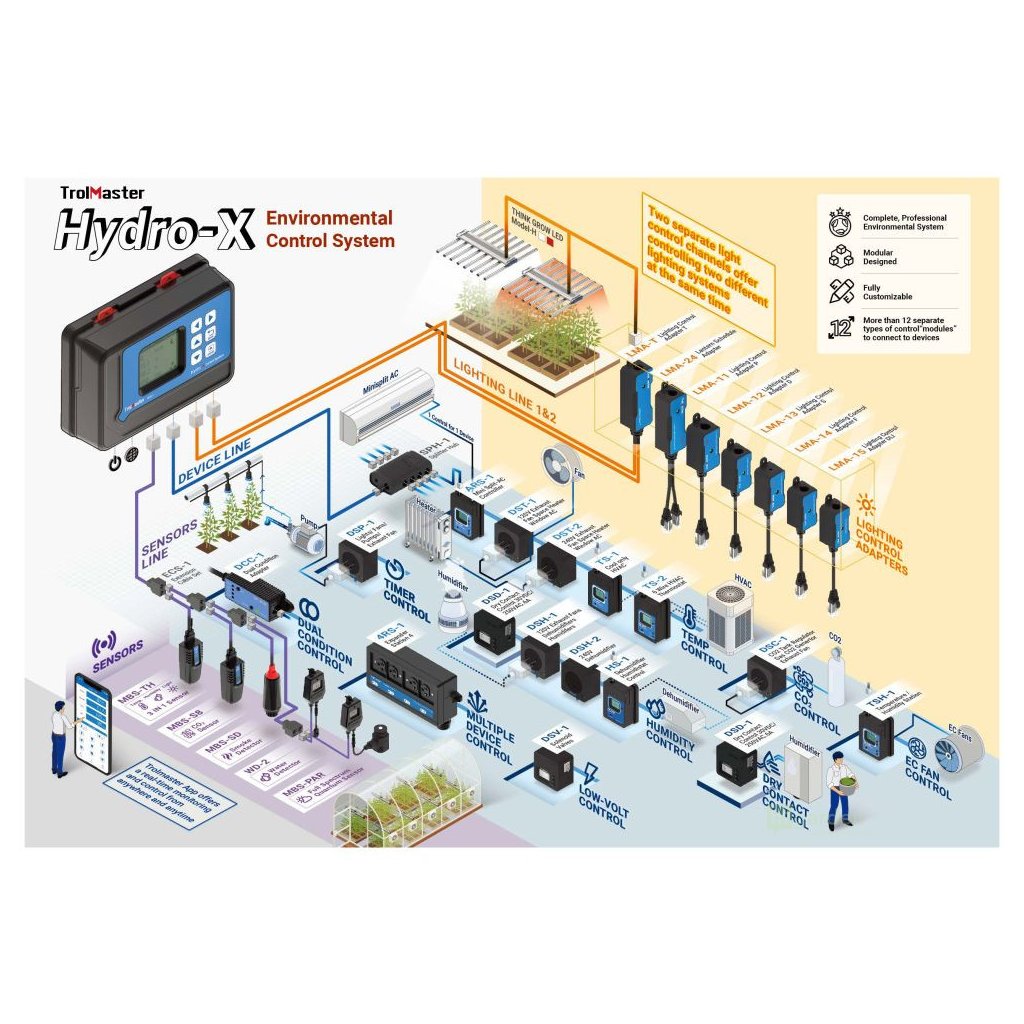 The Hydro-X system is a professional single-zone environmental control system. It is fully customizable and modularly designed. Installation is simple and the system can be easily expanded. The Hydro-X system can control most brands of grow lights, HVAC systems, mini-split air conditioners, commercial dehumidifiers and humidifiers, as well as CO2 generators or controllers. With the free TrolMaster app, the user can access all system settings and alerts from anywhere, anytime.