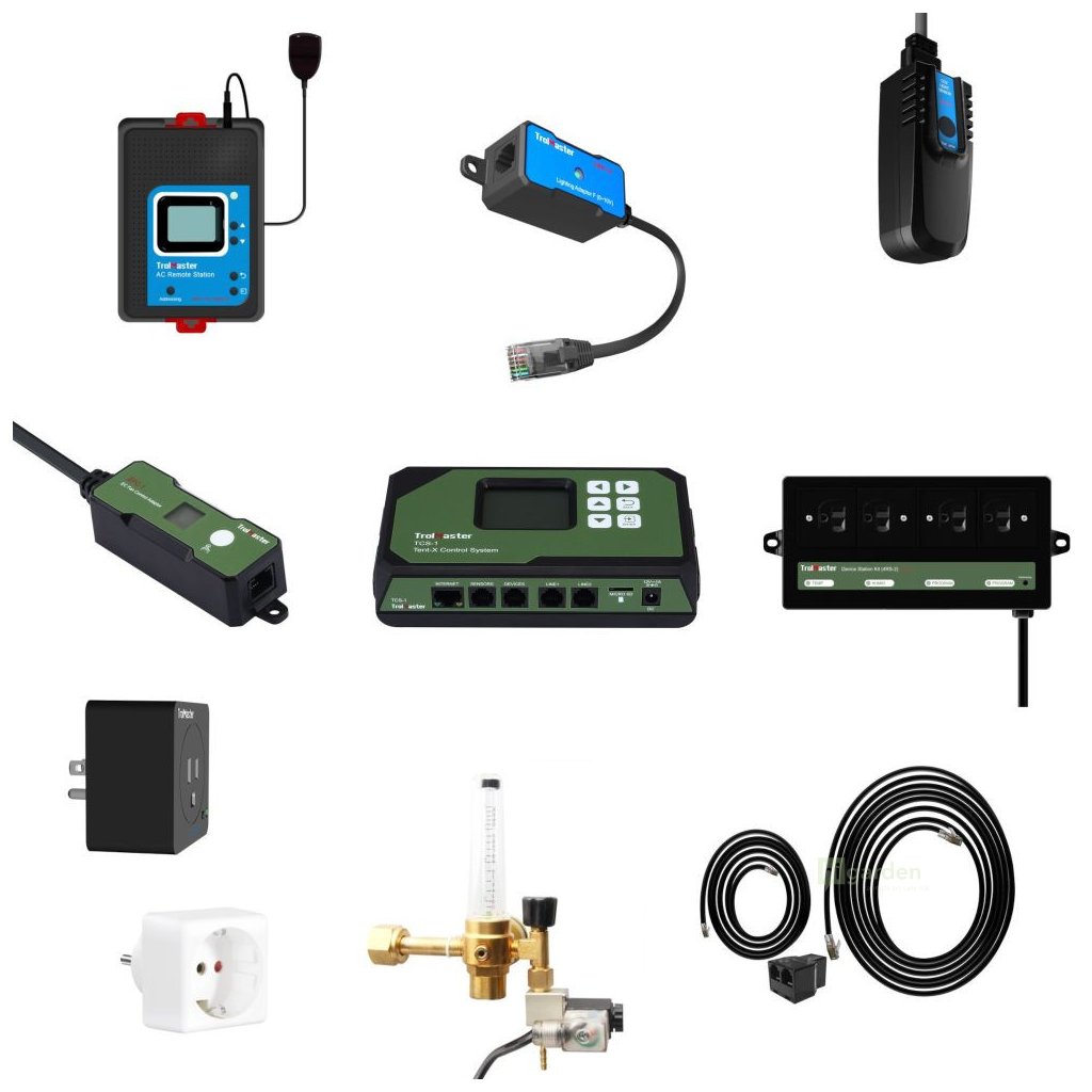 Trolmaster Set Tent-X Closed Loop CO2 system includes Trolmaster Tent-X Main Controller 3-in-1 Sensor (TCS-1), Trolmaster Device Station Kit including 1x DST, 1x DSH, 2x DSP (4RS-2E), Trolmaster Lighting Control Adapter F for 0-10V protocol (LMA-14), Trolmaster EC Fan Control Adaptor (EFC-1) and other Trolmaster accessories.